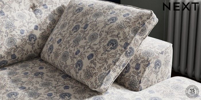 7.3.1 Buy Stamford Buttoned Back Small Sofa Chaise - Right Hand Relaxed Linen Look Print Woodblock Floral Blue Large Square Angle - Brushed Brass from the Seasons online shop Click here to use our website with more accessibility support, for example screen readers