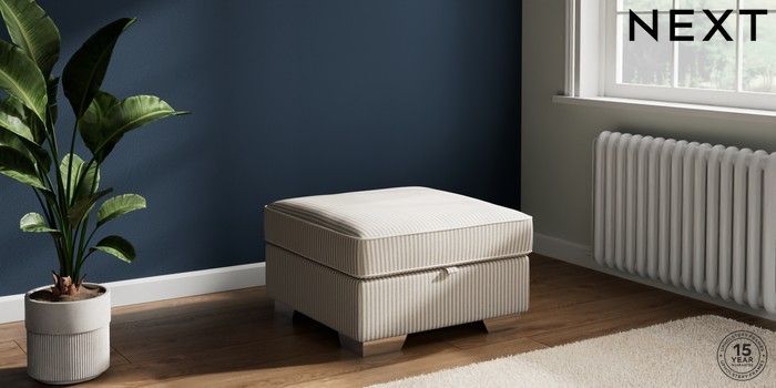 7.3.1 Buy Stamford Buttoned Back Storage Footstool Chenille Stripe Natural Square Angle - Chrome Metal from the Seasons online shop Click here to use our website with more accessibility support, for example screen readers