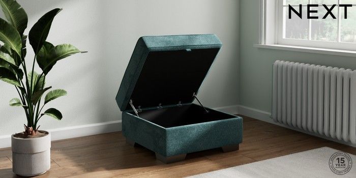 7.2.10 Buy Stamford Buttoned Back Storage Footstool Chunky Chenille Mid Teal Green Square Angle - Gunmetal from the Seasons online shop Click here to use our website with more accessibility support, for example screen readers