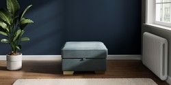 7.2.10 Buy Stamford Buttoned Back Storage Footstool Fine Chenille Easy Clean Mid Blue Square Angle - Brushed Brass from the Seasons online shop Click here to use our website with more accessibility support, for example screen readers
