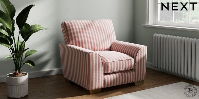 7.3.1 Buy Stamford Grand Relaxed Sit Armchair Bold Chenille Stripe Dark Pink Square Angle - Brushed Brass from the Seasons online shop Click here to use our website with more accessibility support, for example screen readers