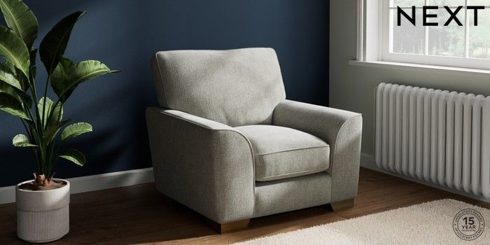 7.3.1 Buy Stamford Grand Relaxed Sit Armchair Chunky Chenille Light Grey Square Angle - Brushed Brass from the Seasons online shop Click here to use our website with more accessibility support, for example screen readers