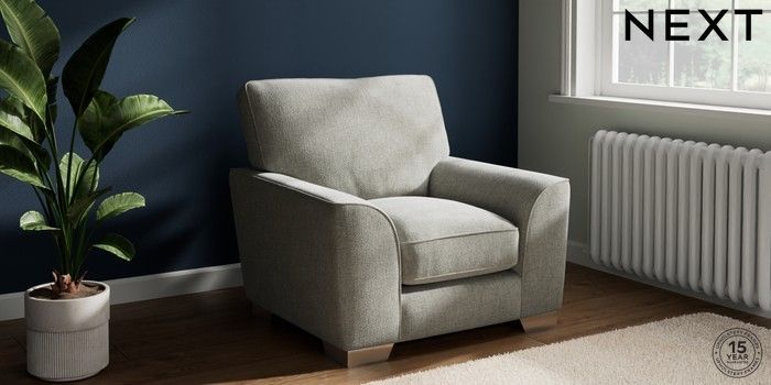 7.3.1 Buy Stamford Grand Relaxed Sit Armchair Chunky Chenille Light Grey Square Angle - Chrome Metal from the Seasons online shop Click here to use our website with more accessibility support, for example screen readers