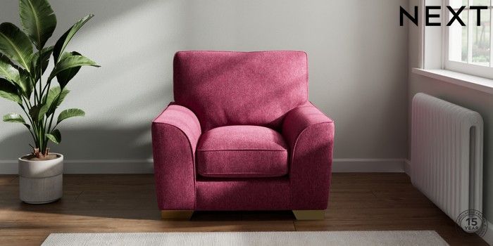 7.3.1 Buy Stamford Grand Relaxed Sit Armchair Cotswold Chenille Dark Raspberry Pink Square Angle - Brushed Brass from the Seasons online shop Click here to use our website with more accessibility support, for example screen readers