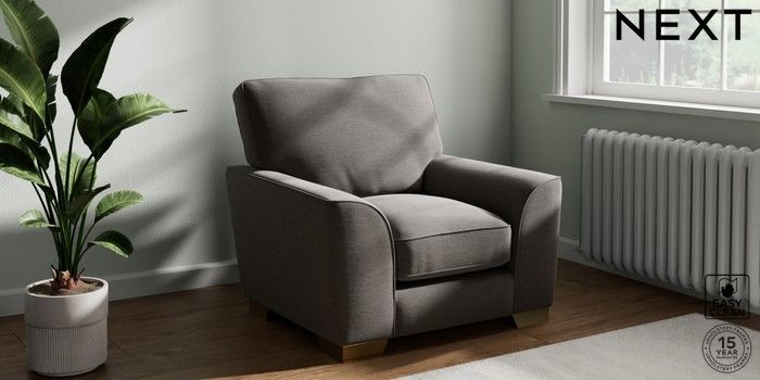 7.3.1 Buy Stamford Grand Relaxed Sit Armchair Fine Chenille Easy Clean Dark Smoke Grey Square Angle - Brushed Brass from the Seasons online shop Click here to use our website with more accessibility support, for example screen readers