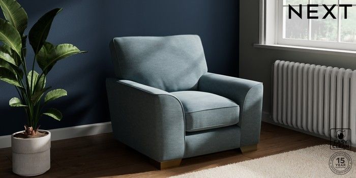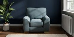 7.3.1 Buy Stamford Grand Relaxed Sit Armchair Fine Chenille Easy Clean Mid Blue Square Angle - Brushed Brass from the Seasons online shop Click here to use our website with more accessibility support, for example screen readers