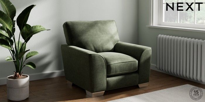 7.3.1 Buy Stamford Grand Relaxed Sit Armchair Luxe Chenille Mid Green Square Angle - Chrome Metal from the Seasons online shop Click here to use our website with more accessibility support, for example screen readers