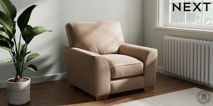 7.3.1 Buy Stamford Grand Relaxed Sit Armchair Luxe Chenille Mid Natural Square Angle - Brushed Brass from the Seasons online shop Click here to use our website with more accessibility support, for example screen readers