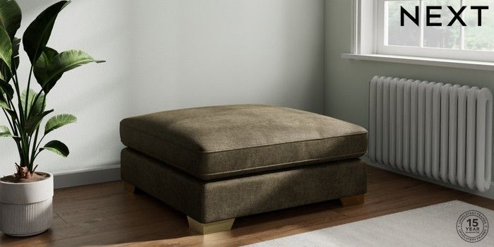 7.3.1 Buy Stamford Grand Relaxed Sit Extra Large Footstool Plush Chenille Moss Green Square Angle - Brushed Brass from the Seasons online shop Click here to use our website with more accessibility support, for example screen readers