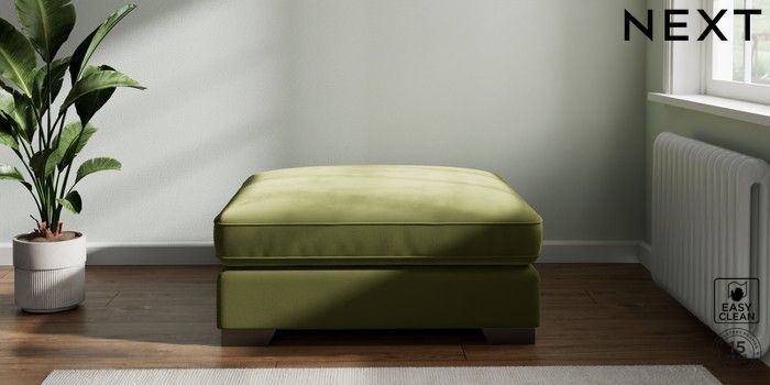 7.3.1 Buy Stamford Grand Relaxed Sit Extra Large Footstool Plush Velvet Easy Clean Mid Olive Green Square Angle - Gunmetal from the Seasons online shop