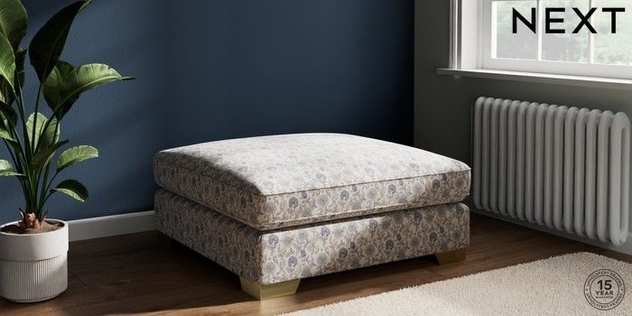 7.3.1 Buy Stamford Grand Relaxed Sit Extra Large Footstool Relaxed Linen Look Print Woodblock Floral Blue Square Angle - Brushed Brass from the Seasons online shop