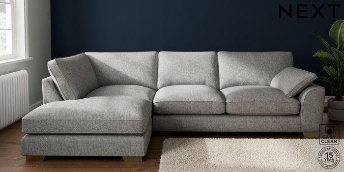 7.3.1 Buy Stamford Grand Relaxed Sit Large Corner Chaise - Left Hand Chunky Boucle Easy Clean Light Grey Large Square Angle - Brushed Brass from the Seasons online shop Click here to use our website with more accessibility support, for example screen readers