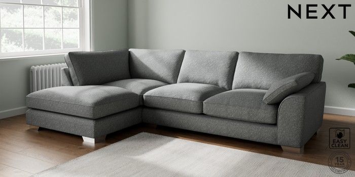7.3.1 Buy Stamford Grand Relaxed Sit Large Corner Chaise - Left Hand Chunky Boucle Easy Clean Mid Grey Large Square Angle - Chrome Metal from the Seasons online shop Click here to use our website with more accessibility support, for example screen readers