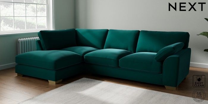 7.3.1 Buy Stamford Grand Relaxed Sit Large Corner Chaise - Left Hand Plush Velvet Easy Clean Juniper Green Large Square Angle - Brushed Brass from the Seasons online shop Click here to use our website with more accessibility support, for example screen readers