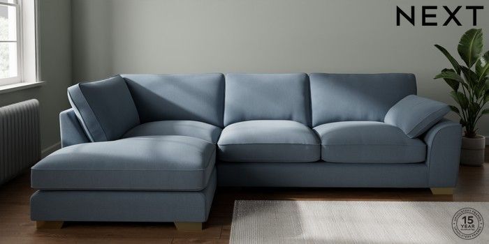 7.3.1 Buy Stamford Grand Relaxed Sit Large Corner Chaise - Left Hand Relaxed Linen Look Mid Blue Large Square Angle - Brushed Brass from the Seasons online shop Click here to use our website with more accessibility support, for example screen readers