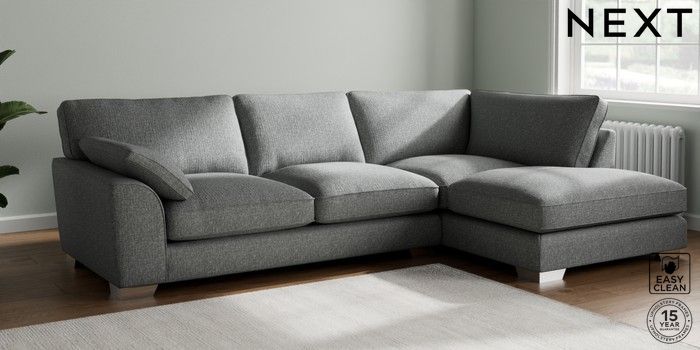 7.3.1 Buy Stamford Grand Relaxed Sit Large Corner Chaise - Right Hand Chunky Boucle Easy Clean Mid Grey Large Square Angle - Chrome Metal from the Seasons online shop Click here to use our website with more accessibility support, for example screen readers