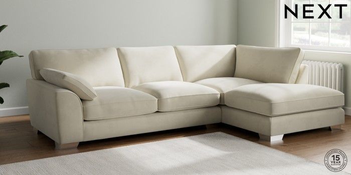 7.3.1 Buy Stamford Grand Relaxed Sit Large Corner Chaise - Right Hand Luxe Chenille Oyster Large Square Angle - Chrome Metal from the Seasons online shop Click here to use our website with more accessibility support, for example screen readers