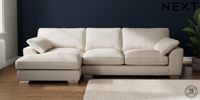 7.3.1 Buy Stamford Grand Relaxed Sit Large Sofa Chaise - Left Hand Chenille Stripe Natural Large Square Angle - Chrome Metal from the Seasons online shop Click here to use our website with more accessibility support, for example screen readers