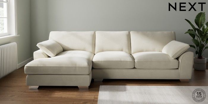 7.3.1 Buy Stamford Grand Relaxed Sit Large Sofa Chaise - Left Hand Luxe Chenille Oyster Large Square Angle - Chrome Metal from the Seasons online shop Click here to use our website with more accessibility support, for example screen readers