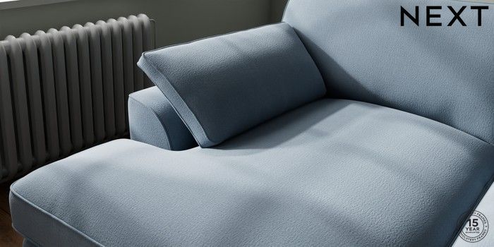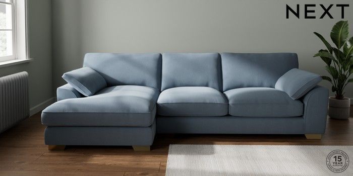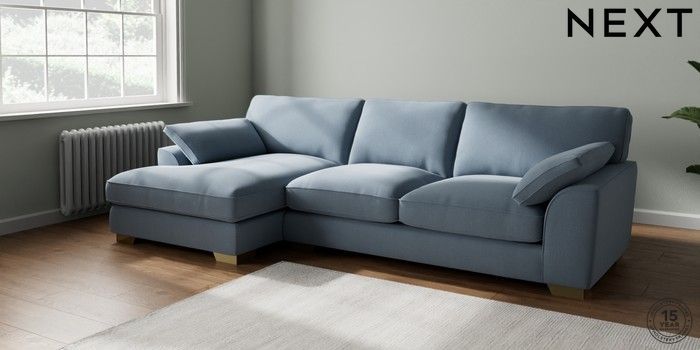 7.3.1 Buy Stamford Grand Relaxed Sit Large Sofa Chaise - Left Hand Relaxed Linen Look Mid Blue Large Square Angle - Brushed Brass from the Seasons online shop Click here to use our website with more accessibility support, for example screen readers