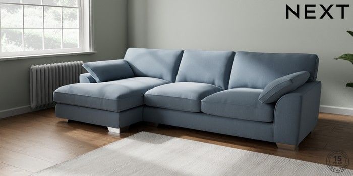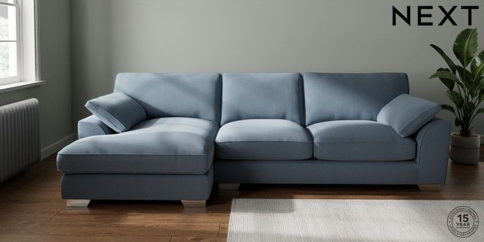 7.3.1 Buy Stamford Grand Relaxed Sit Large Sofa Chaise - Left Hand Relaxed Linen Look Mid Blue Large Square Angle - Chrome Metal from the Seasons online shop Click here to use our website with more accessibility support, for example screen readers