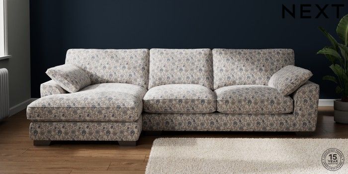 7.3.1 Buy Stamford Grand Relaxed Sit Large Sofa Chaise - Left Hand Relaxed Linen Look Print Woodblock Floral Blue Large Square Angle - Gunmetal from the Seasons online shop