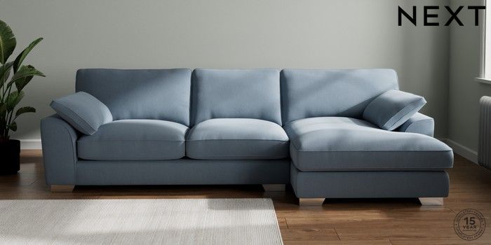 7.3.1 Buy Stamford Grand Relaxed Sit Large Sofa Chaise - Right Hand Relaxed Linen Look Mid Blue Large Square Angle - Chrome Metal from the Seasons online shop Click here to use our website with more accessibility support, for example screen readers