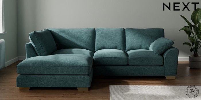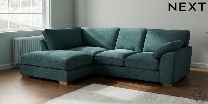 7.3.1 Buy Stamford Grand Relaxed Sit Medium Corner Chaise - Left Hand Chunky Chenille Mid Teal Green Large Square Angle - Brushed Brass from the Seasons online shop Click here to use our website with more accessibility support, for example screen readers