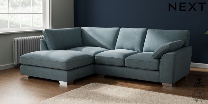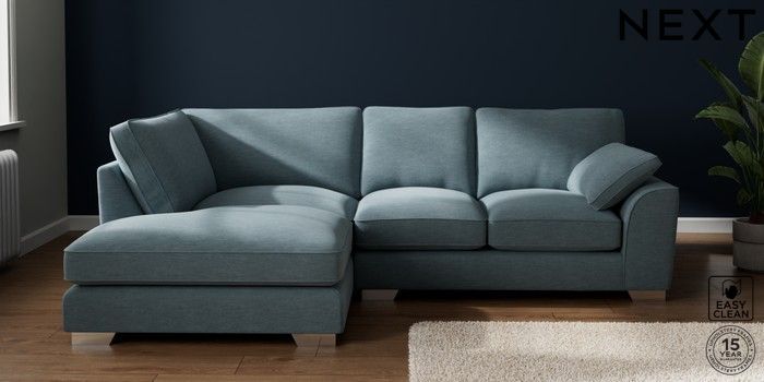 7.3.1 Buy Stamford Grand Relaxed Sit Medium Corner Chaise - Left Hand Fine Chenille Easy Clean Mid Blue Large Square Angle - Chrome Metal from the Seasons online shop Click here to use our website with more accessibility support, for example screen readers