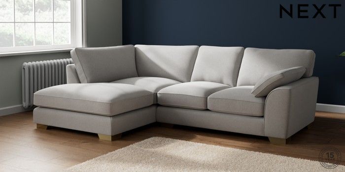 7.3.1 Buy Stamford Grand Relaxed Sit Medium Corner Chaise - Left Hand Natural Mix Light Grey Large Square Angle - Brushed Brass from the Seasons online shop Click here to use our website with more accessibility support, for example screen readers