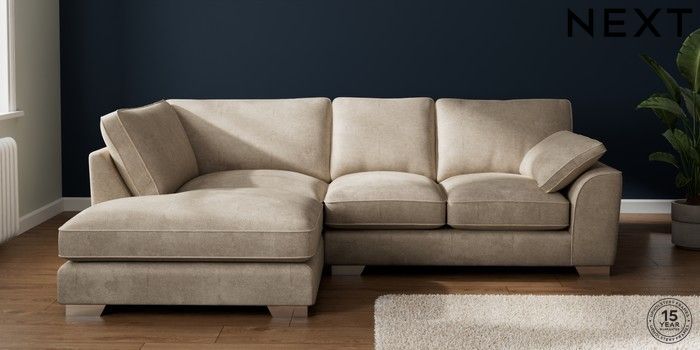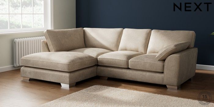 7.3.1 Buy Stamford Grand Relaxed Sit Medium Corner Chaise - Left Hand Plush Chenille Light Natural Large Square Angle - Chrome Metal from the Seasons online shop Click here to use our website with more accessibility support, for example screen readers