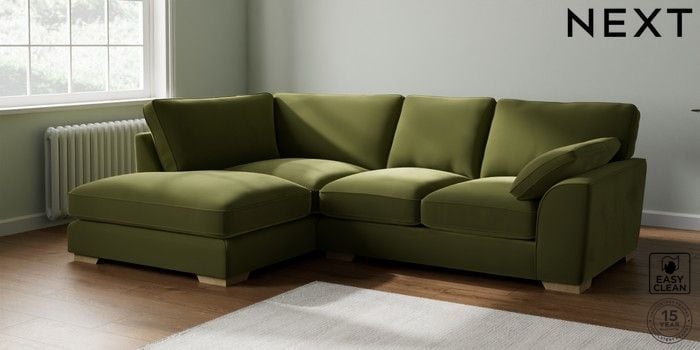 7.3.1 Buy Stamford Grand Relaxed Sit Medium Corner Chaise - Left Hand Plush Velvet Easy Clean Mid Olive Green Large Square Angle - Light from the Seasons online shop Click here to use our website with more accessibility support, for example screen readers