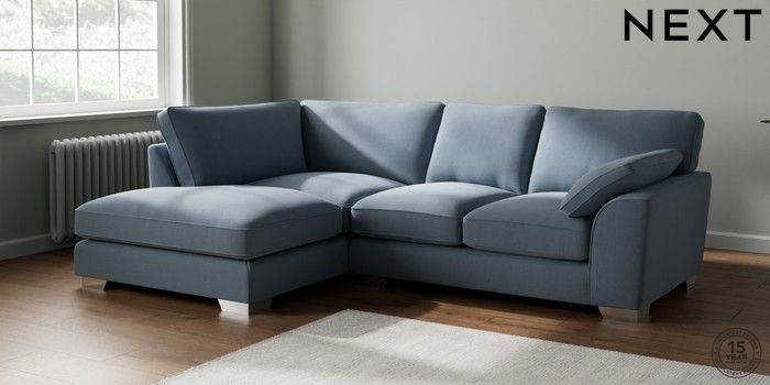 7.3.1 Buy Stamford Grand Relaxed Sit Medium Corner Chaise - Left Hand Relaxed Linen Look Mid Blue Large Square Angle - Chrome Metal from the Seasons online shop Click here to use our website with more accessibility support, for example screen readers