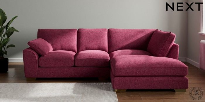 7.3.1 Buy Stamford Grand Relaxed Sit Medium Corner Chaise - Right Hand Cotswold Chenille Dark Raspberry Pink Large Square Angle - Brushed Brass from the Seasons online shop Click here to use our website with more accessibility support, for example screen readers