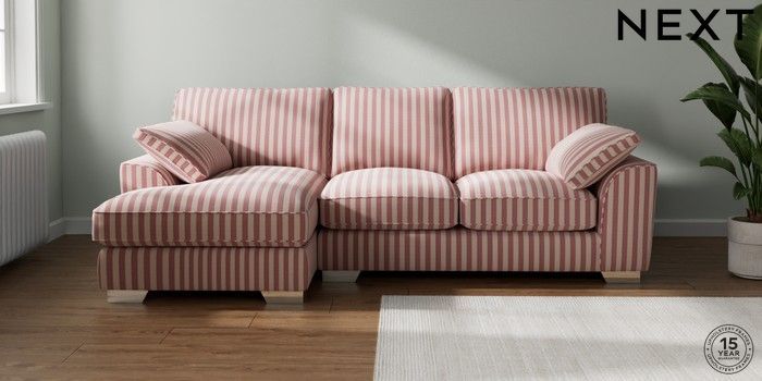 7.3.1 Buy Stamford Grand Relaxed Sit Medium Sofa Chaise - Left Hand Bold Chenille Stripe Dark Pink Large Square Angle - Chrome Metal from the Seasons online shop Click here to use our website with more accessibility support, for example screen readers