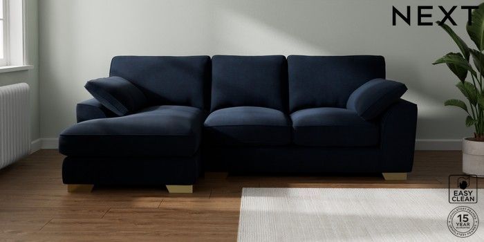7.3.1 Buy Stamford Grand Relaxed Sit Medium Sofa Chaise - Left Hand Fine Chenille Easy Clean Dark Navy Blue Large Square Angle - Brushed Brass from the Seasons online shop Click here to use our website with more accessibility support, for example screen readers