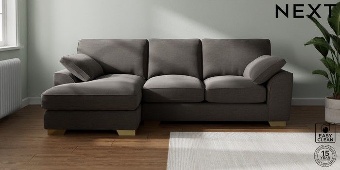 7.3.1 Buy Stamford Grand Relaxed Sit Medium Sofa Chaise - Left Hand Fine Chenille Easy Clean Dark Smoke Grey Large Square Angle - Brushed Brass from the Seasons online shop Click here to use our website with more accessibility support, for example screen readers