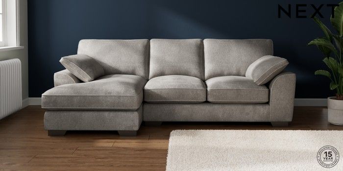 7.3.1 Buy Stamford Grand Relaxed Sit Medium Sofa Chaise - Left Hand Plush Chenille Light Grey Large Square Angle - Gunmetal from the Seasons online shop Click here to use our website with more accessibility support, for example screen readers