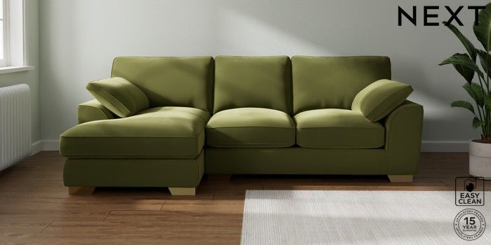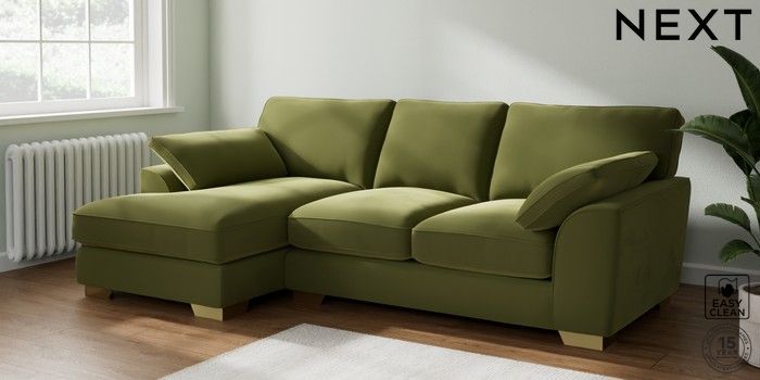 7.3.1 Buy Stamford Grand Relaxed Sit Medium Sofa Chaise - Left Hand Plush Velvet Easy Clean Mid Olive Green Large Square Angle - Brushed Brass from the Seasons online shop Click here to use our website with more accessibility support, for example screen readers