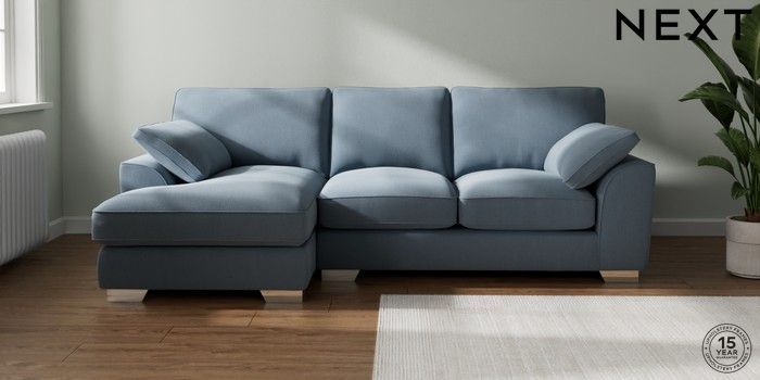 7.3.1 Buy Stamford Grand Relaxed Sit Medium Sofa Chaise - Left Hand Relaxed Linen Look Mid Blue Large Square Angle - Chrome Metal from the Seasons online shop Click here to use our website with more accessibility support, for example screen readers