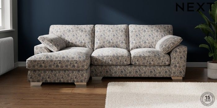 7.3.1 Buy Stamford Grand Relaxed Sit Medium Sofa Chaise - Left Hand Relaxed Linen Look Print Woodblock Floral Blue Large Square Angle - Chrome Metal from the Seasons online shop
