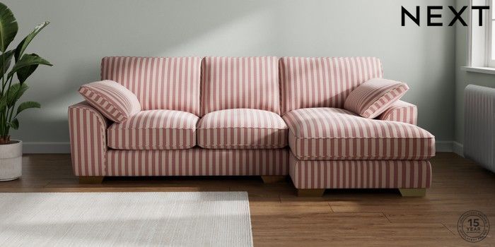 7.3.1 Buy Stamford Grand Relaxed Sit Medium Sofa Chaise - Right Hand Bold Chenille Stripe Dark Pink Large Square Angle - Brushed Brass from the Seasons online shop Click here to use our website with more accessibility support, for example screen readers