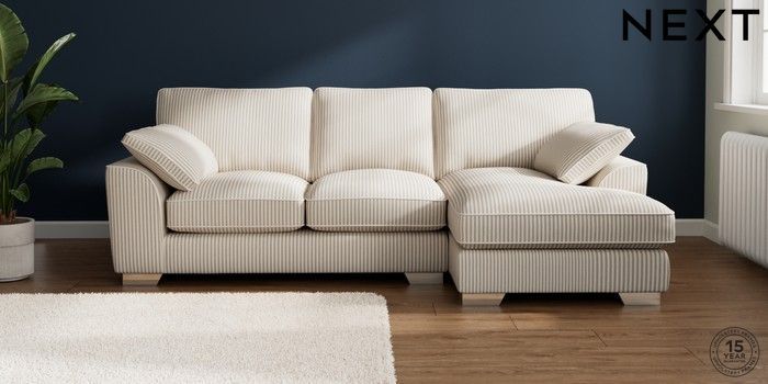 7.3.1 Buy Stamford Grand Relaxed Sit Medium Sofa Chaise - Right Hand Chenille Stripe Natural Large Square Angle - Chrome Metal from the Seasons online shop Click here to use our website with more accessibility support, for example screen readers