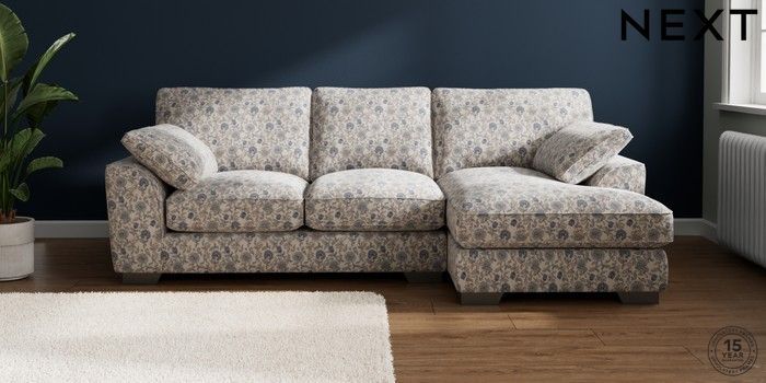 7.3.1 Buy Stamford Grand Relaxed Sit Medium Sofa Chaise - Right Hand Relaxed Linen Look Print Woodblock Floral Blue Large Square Angle - Gunmetal from the Seasons online shop