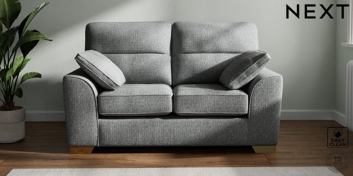 7.2.10 Buy Stamford Highback 2 Seater Small Sofa Chunky Boucle Easy Clean Mid Grey Large Square Angle - Brushed Brass from the Seasons online shop Click here to use our website with more accessibility support, for example screen readers