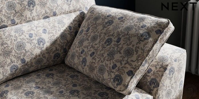 7.3.1 Buy Stamford Highback 2 Seater Small Sofa Relaxed Linen Look Print Woodblock Floral Blue Large Square Angle - Chrome Metal from the Seasons online shop