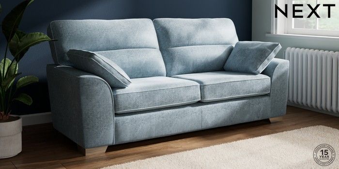 7.2.10 Buy Stamford Highback 3 Seater Sofa Plush Chenille Light Blue Large Square Angle - Chrome Metal from the Seasons online shop Click here to use our website with more accessibility support, for example screen readers