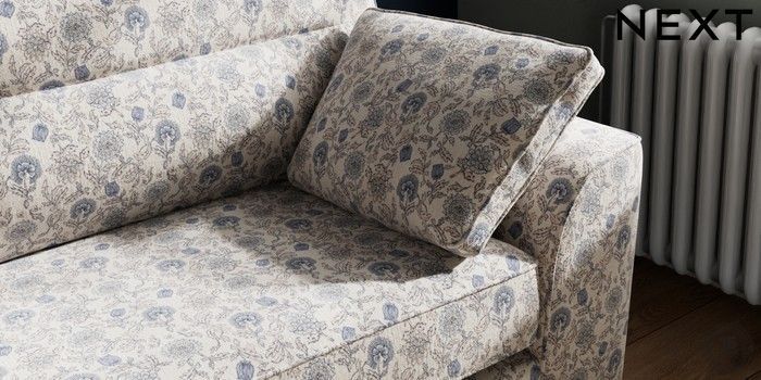 7.3.1 Buy Stamford Highback 4 Seater Sofa Relaxed Linen Look Print Woodblock Floral Blue Large Square Angle - Brushed Brass from the Seasons online shop