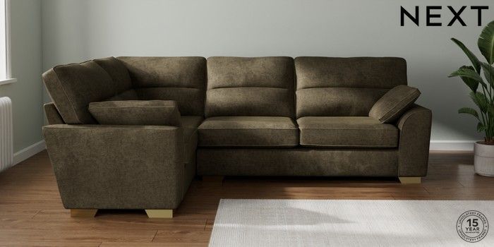 7.2.10 Buy Stamford Highback Large Corner Sofa - Left Hand Plush Chenille Moss Green Large Square Angle - Brushed Brass from the Seasons online shop Click here to use our website with more accessibility support, for example screen readers