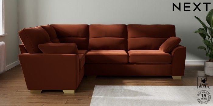 7.3.1 Buy Stamford Highback Large Corner Sofa - Left Hand Plush Velvet Easy Clean Ginger Orange Large Square Angle - Brushed Brass from the Seasons online shop Click here to use our website with more accessibility support, for example screen readers
